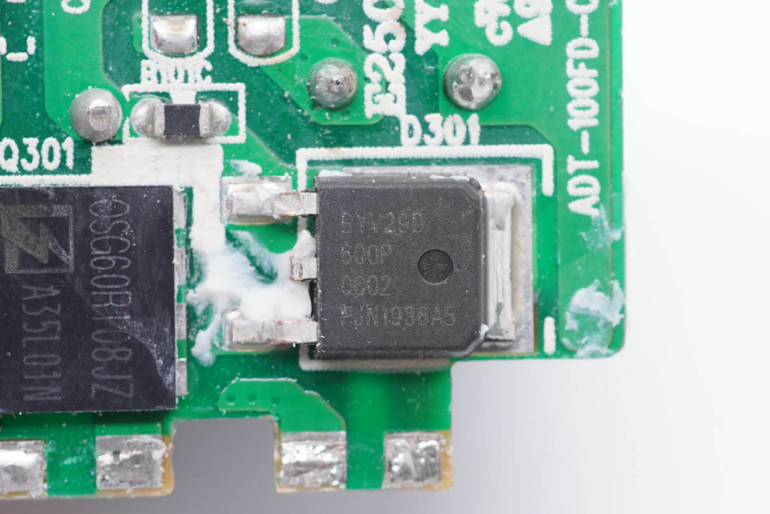 旁边是一颗PFC整流管。瑞能 BYD29D-600P,超快恢复二极管,耐压600V,正向电流9A,采用TO252封装。