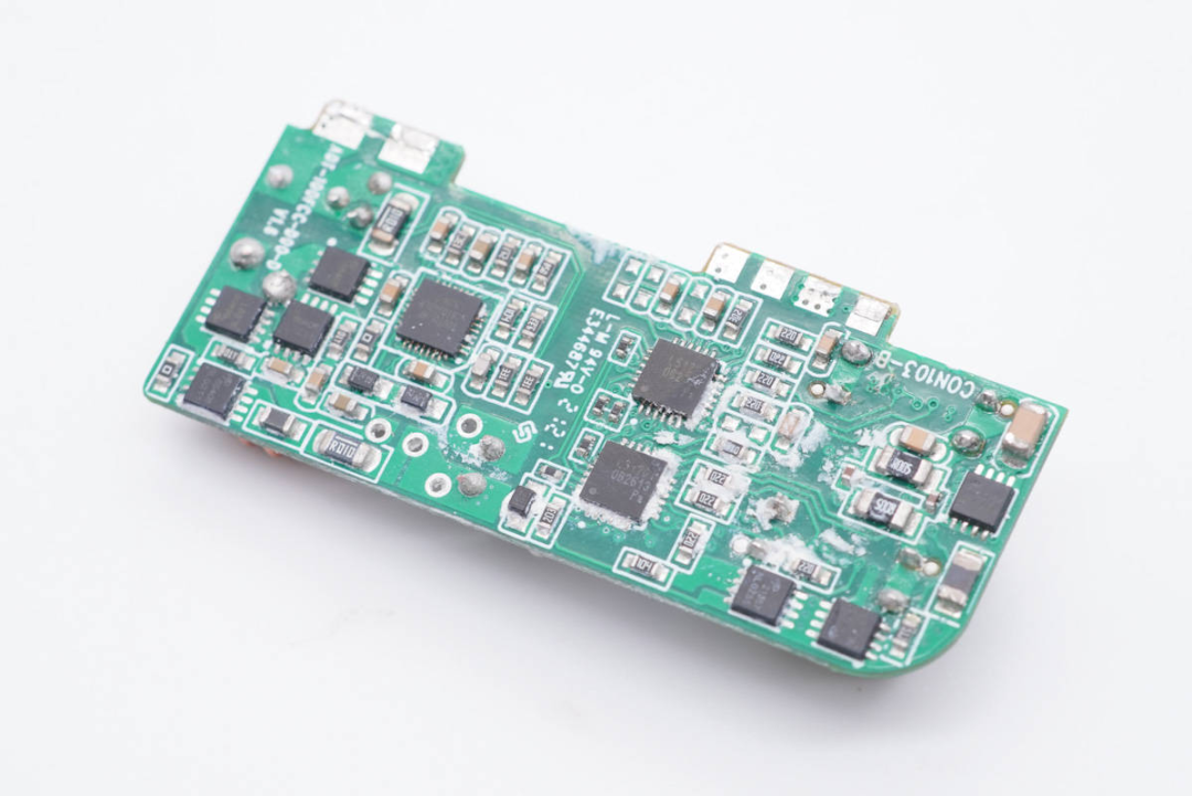 小板背面,左侧是同步升降压控制器与四颗MOS管组成的二次调压电路,中间是两颗协议芯片,右端有三颗输出保护管。