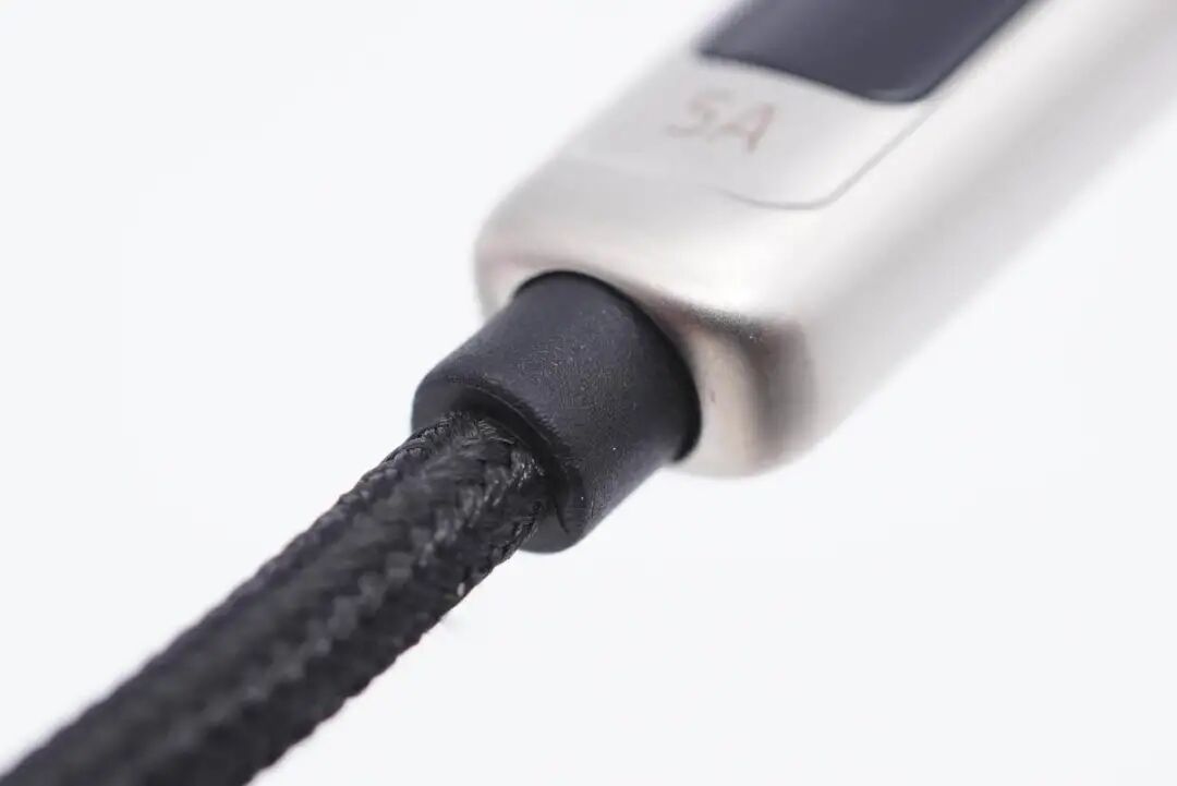 USB-C线头也是一体成型锌合金外壳,并配有高清数显屏,旁边有5A字样,表明线缆支持5A大电流传输。