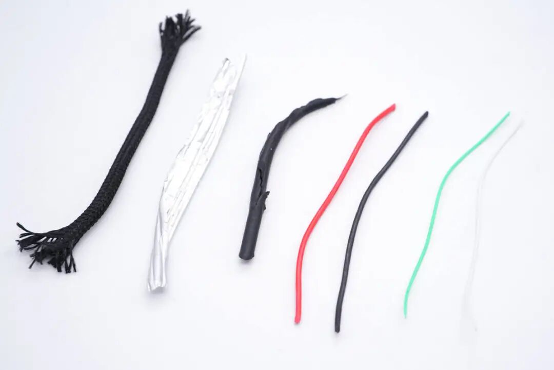 线缆全部拆开一览,从左到右依次是编织外衣、屏蔽锡纸、TPE外皮、红黑电力线芯、白绿数据线芯。