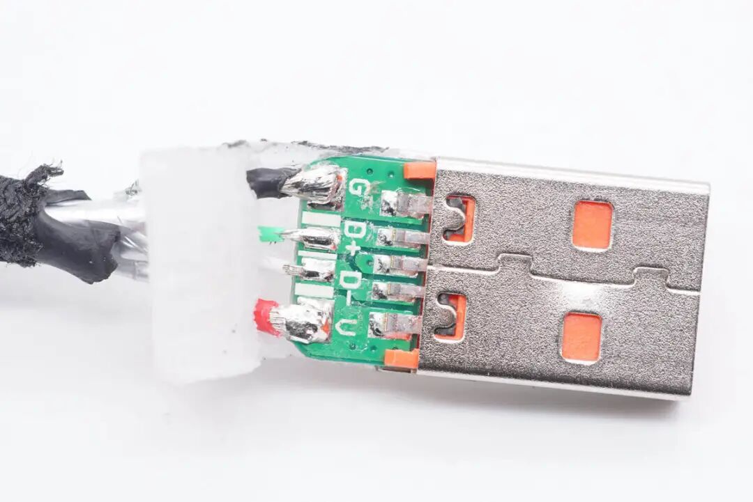 将USB-A线头金属壳切割开,内部填充硬封胶。