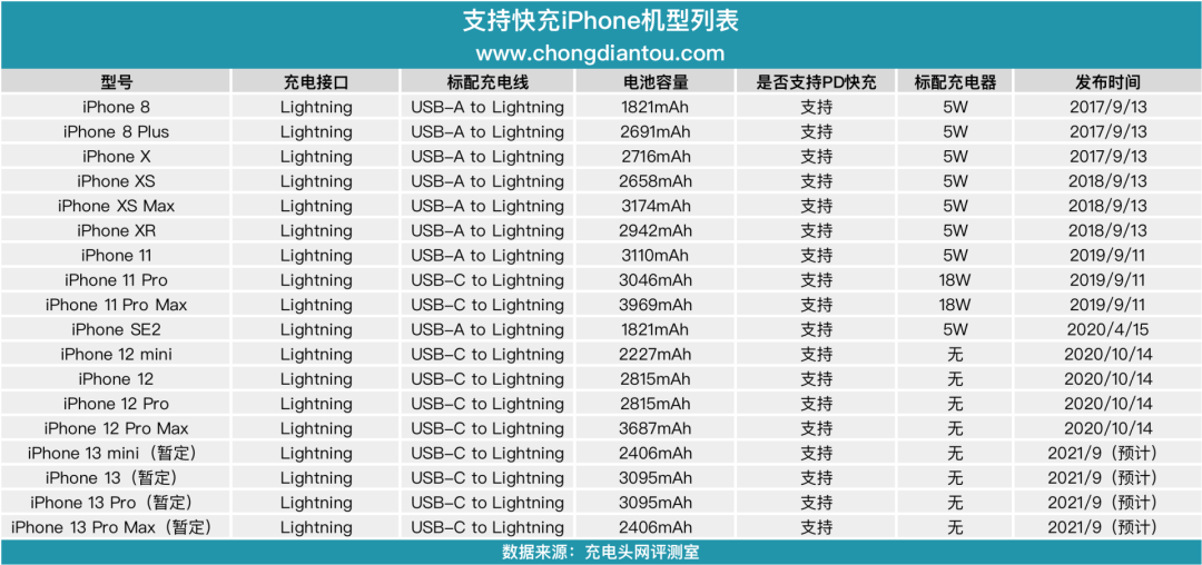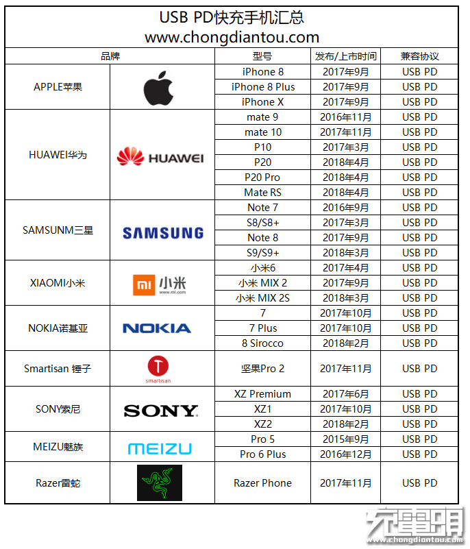 安卓阵营虽有波折,但目前对PD快充的兼容性也不弱,上图统计了2018年各大手机厂商的新机对PD快充的支持程度。到了2021年了,现在的安卓旗舰机型多会提一句对PD或者PPS的兼容性,甚至使用一些新款的大功率 PD快充为一些安卓旗舰充电可以媲美原装充电器的效果。