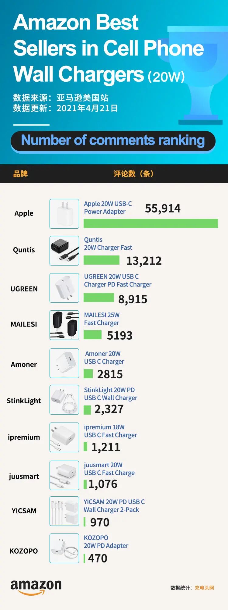 毫无疑问,在ban掉了一堆大户之后,苹果充电器的评论数遥遥领先,比其他九个充电器评论加起来还多。其次就是 Quntis 和绿联,这两款充电器之前也榜上有名,有一定的粉丝积累。其余的品牌由于之前曝光度较低,评论还比较少,在一千至两千左右。