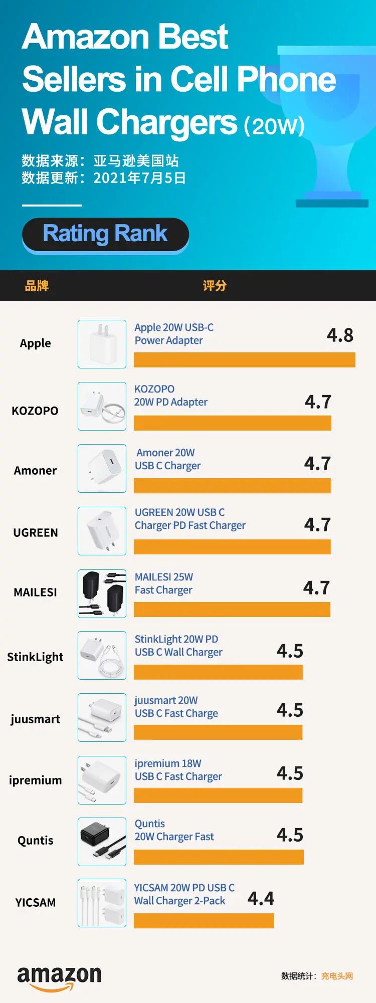 最后就是评分了,苹果自然位居榜首,后面就是KOZOPO、Amoner、绿联、MAILESI,评分都在4.7分。Stinklight、juusmart、ipremuin、Quntis这几款充电器评分来到了4.5分,相对表现一般。