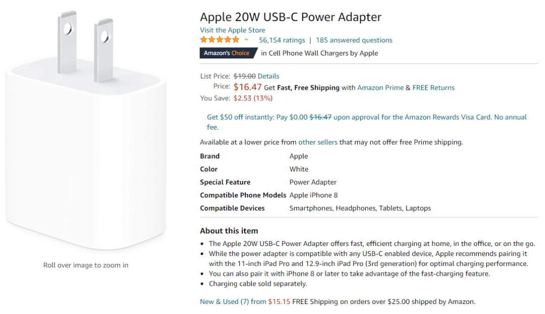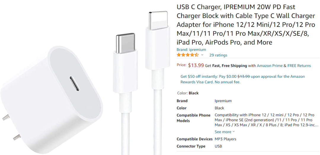 按照价格排序,首当其冲的就是两款组合套装产品,这种消费习惯在国内是很少见的。其余产品的均价都在10刀左右,大部分附赠C2L数据线,毕竟这个品类几乎就是为了 iPhone 量身定制的。单品价格最高的当然还是苹果,充电器单品售价16.47美元约合人民币105元。最低的则是绿联,9.98美元。
