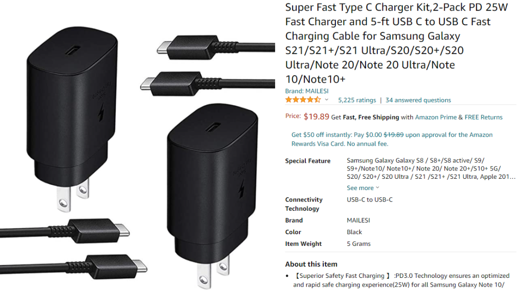 商品页面标注采用了C94芯片,并附有MFi的标志。双套价格打包收买仅需21.99美元,价格很实惠。充电器内置过充保护设计,数据线内置智能芯片,可以在充电和同步时保护iPhone / iPad设备。