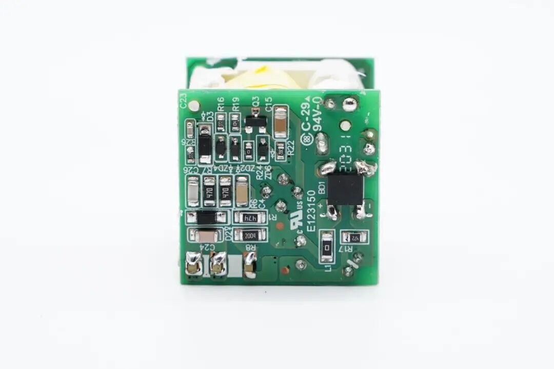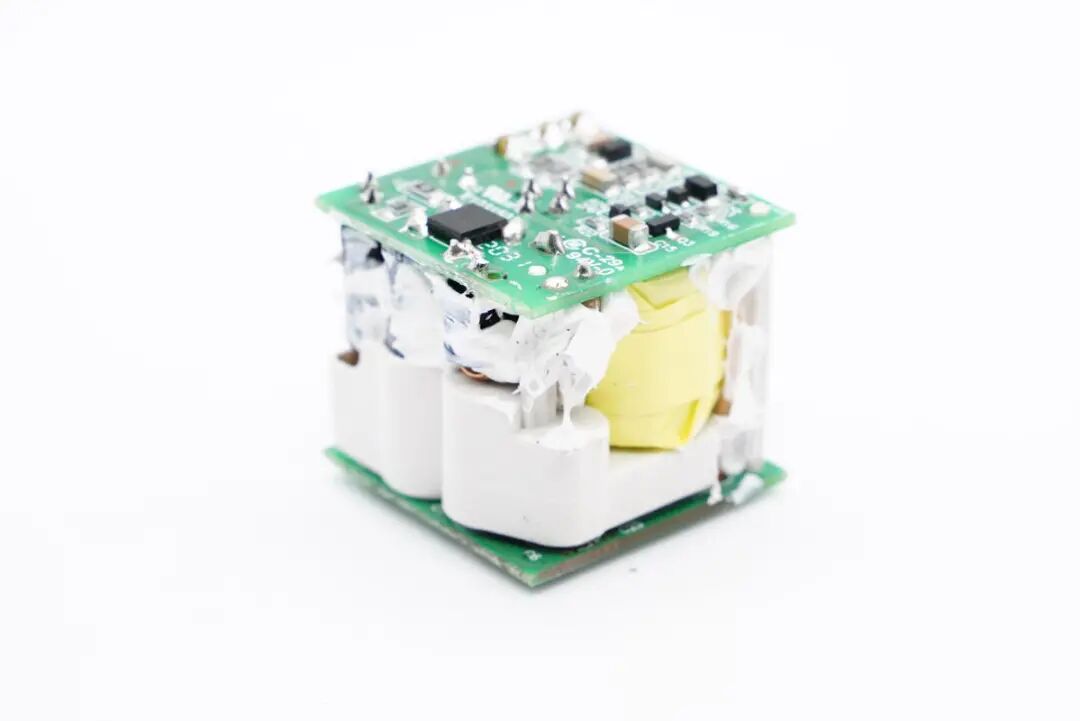 PCBA模块由三块小板组合焊接设计,U型结构。电容、电感、变压器等器件打胶加固,并且初次级间有白色塑料壳进行隔离。