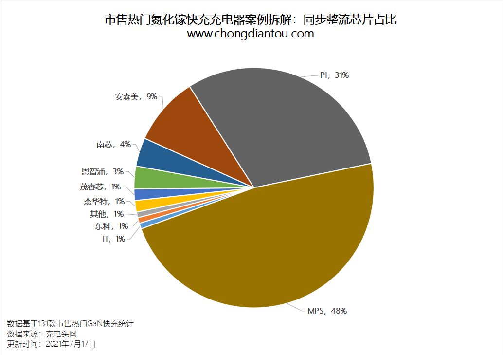 同步整流芯片方面,大头被老牌厂商MPS占据,比例高达48%,这主要是MP6908A这颗芯片做出的贡献,广泛应用于QR快充电源架构中。PI依然稳居第二,占比31%,这也是合封芯片的优势所在。