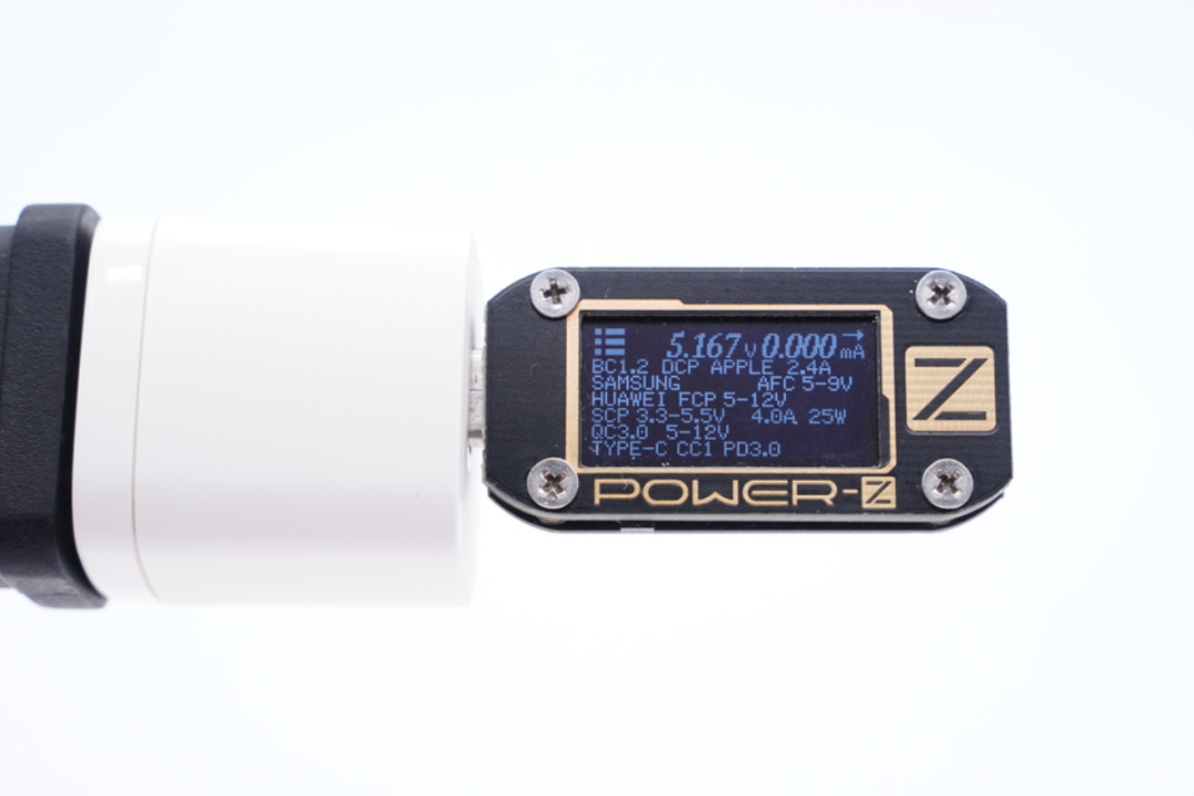 使用POWER-Z KT002 USB测试仪读取PDO报文,充电器基于PD3.0快速充电标准开发,带有5V3A / 9V2.22A / 12V1.67A三个固定电压档,其中9V2.22A正是iPhone 12系列20W快充需求的电压档,符合半小时充入50%电量的性能需求。