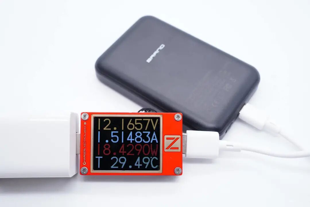 使用20W充电器给移动电源充电,测得充电功率为12.17V 1.51A 18.43W。