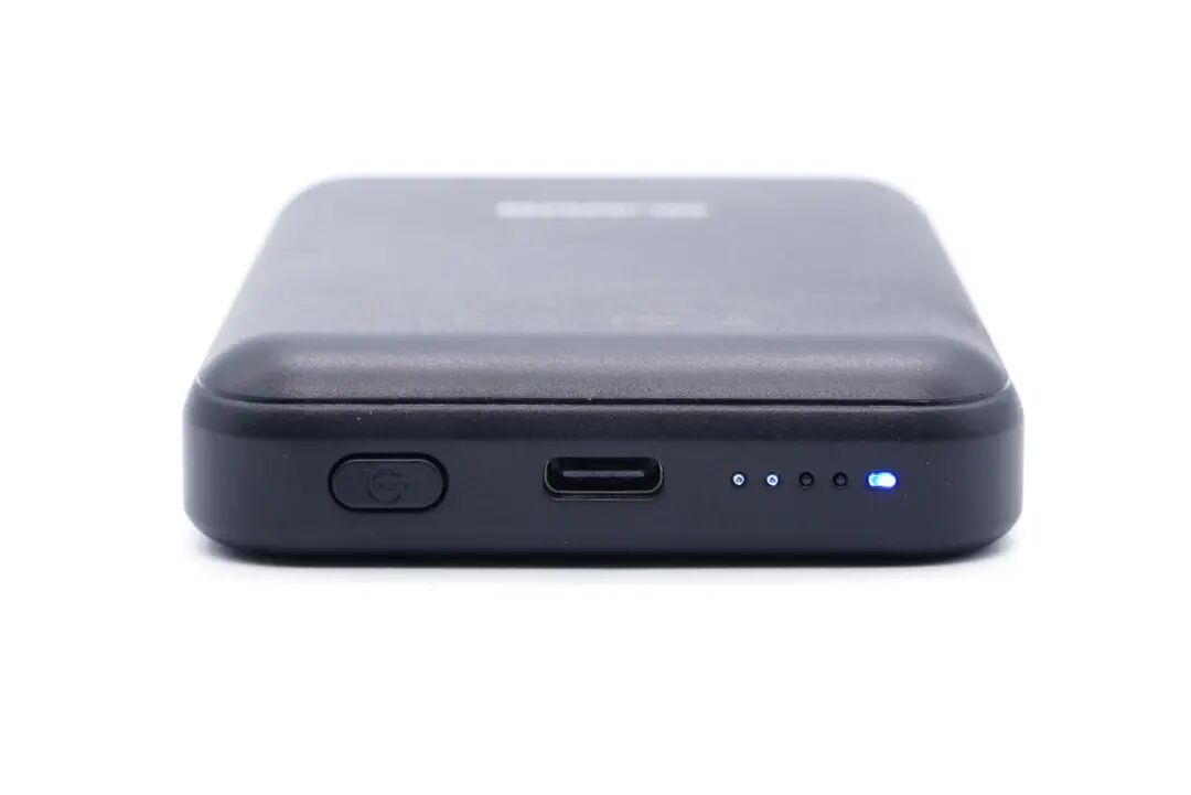 鹏元晟这款磁吸无线充移动电源机身小巧扁平,表面磨砂,边角过渡圆润。