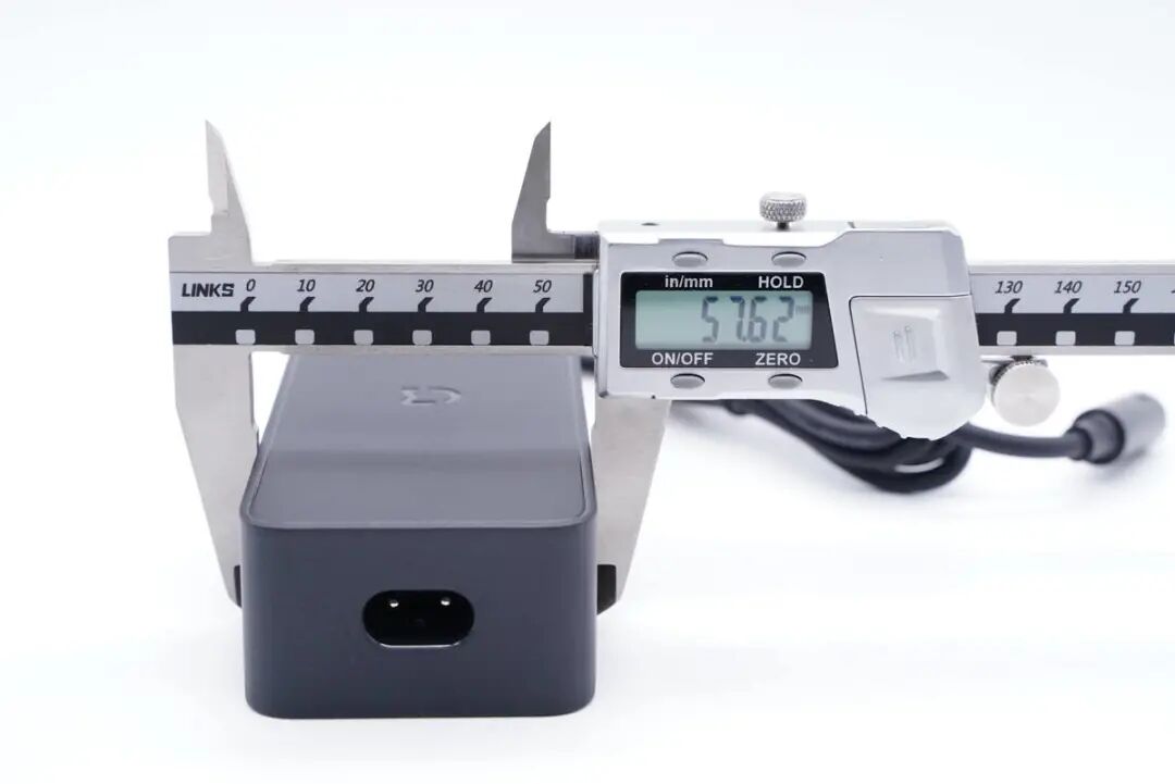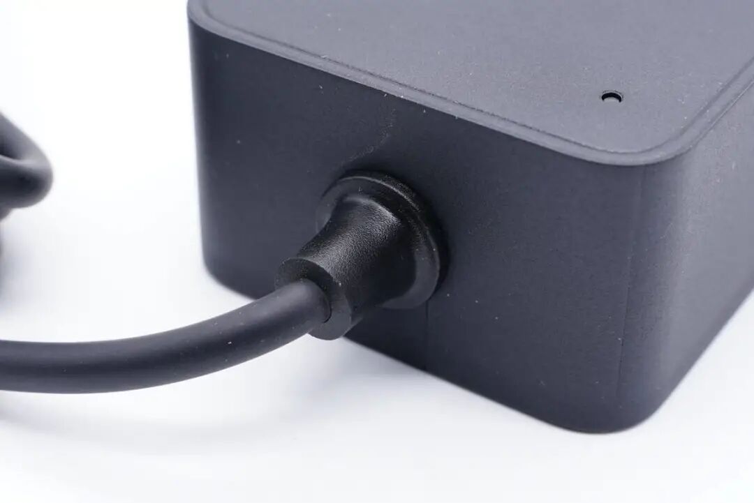 电源本体为板砖造型,自带DC圆头输出线缆。机身壳整体磨砂,端角弧面过渡,整体同样风格简约。