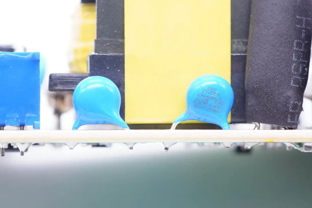 PCB板上元器件布局很有层次感,电感、电容、变压器等器件打胶加固,高压滤波电解电容包裹绝缘胶带。