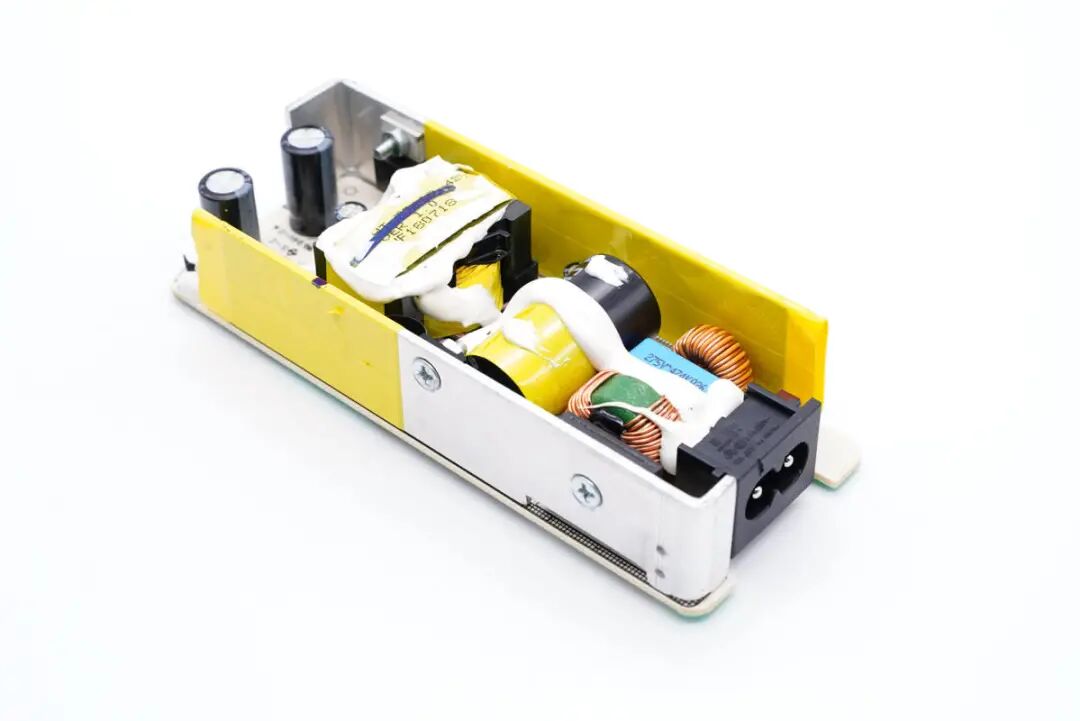 PCB板两侧设有散热片,低压侧与高压侧区域包裹绝缘胶带,整流桥、高压MOS管等器件使用螺丝固定在散热片上。