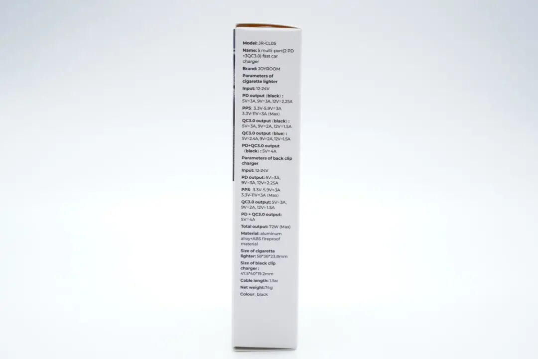 包装盒正面印有JOYROOM品牌、产品型号JR-CL05、名称、外观图和卖点等信息,设计相当丰富。