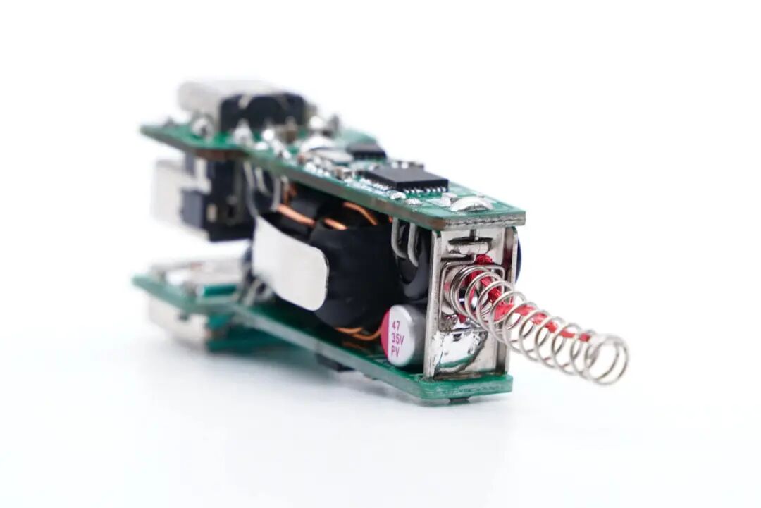 两块小板通过正负极金属片连接固定,之间有输入输出滤波电容和电感。