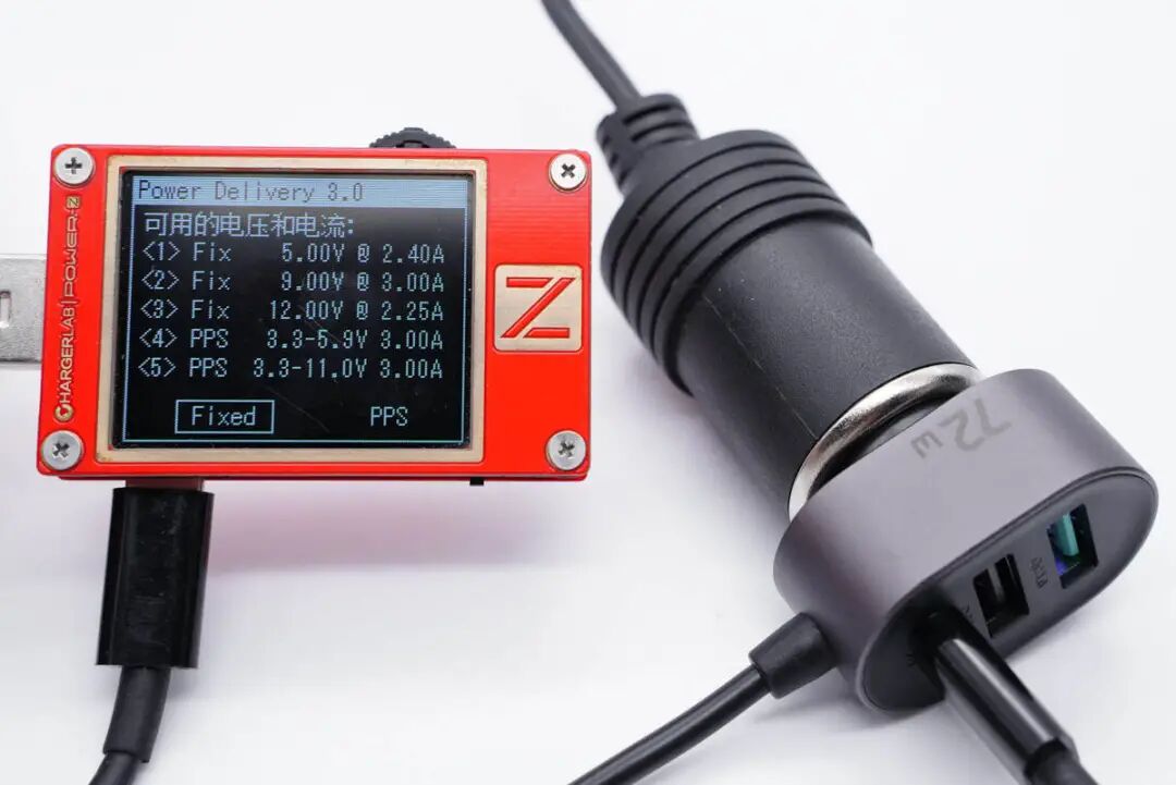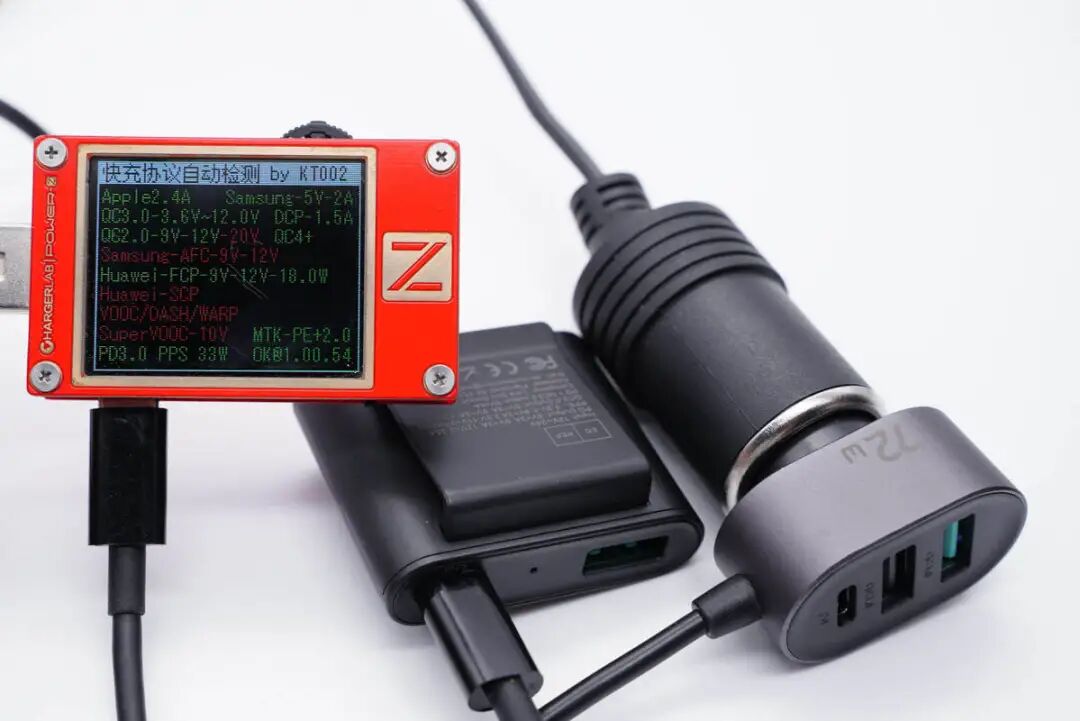 使用ChargerLAB POWER-Z KT002测得车充USB-A口(蓝)支持Apple 2.4A、Samsung 5V2A、DCP协议,以及QC2.0/3.0、AFC、FCP快充协议。