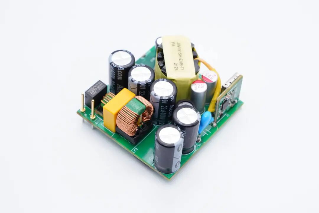 Y电容右侧是输出模块,为了兼顾客户设计方案的多样性,输出控制部分采用独立模块设计。参考设计上配备的模块为PD输出模块,通过协议小板调节输出电压,客户也可以根据需求自行更换输出电压控制模块。