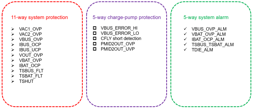 SC8571内部集成了21重不同的保护机制,以确保充电过程安全可靠。其保护机制可以分为以下三类:11重系统级保护、5重电荷泵相关保护、5重系统级报警。