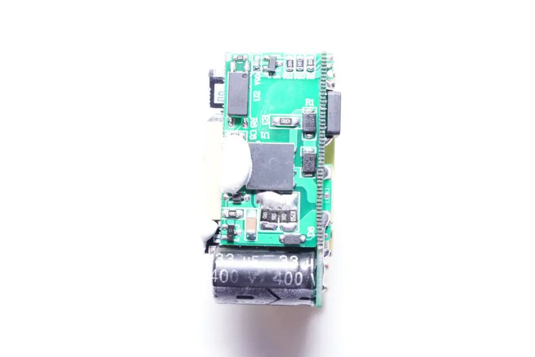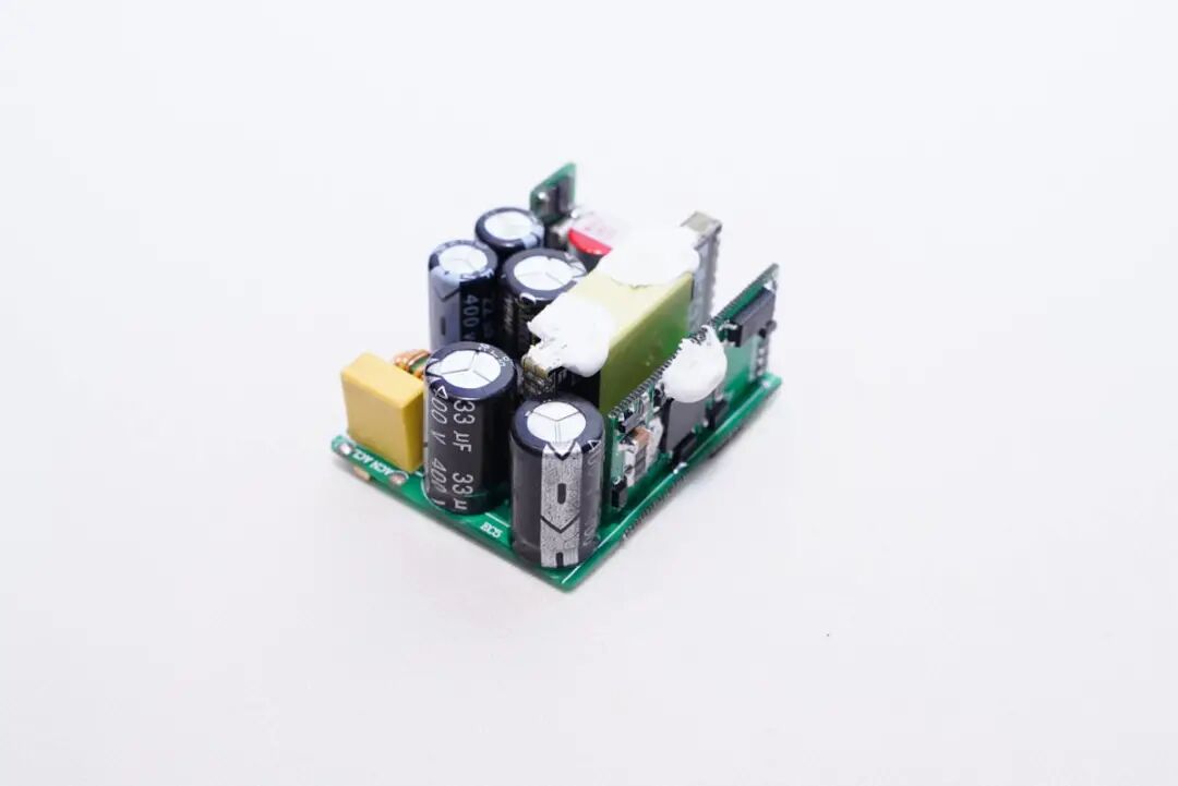 东科65W氮化镓方案采用两块小板和平面变压器垂直焊接的叠板工艺,充分利用空间,输入端有Y电容和共模电感,初级采用5颗电解电容滤波。