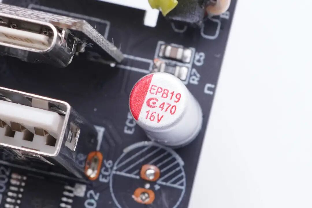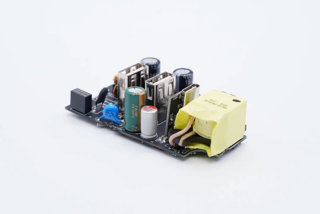 主板一端设有变压器,侧边是Y电容和两颗滤波电容,USB-C母座使用小板垂直焊接。