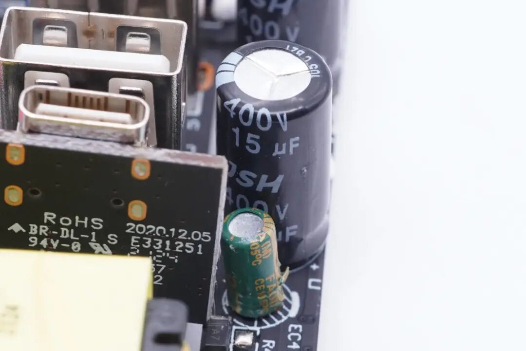 充电器采用了知名大厂PI SC1548C主控芯片搭配威兆VS6614GS同步整流管组成开关电源,以及UC4300+UC4600多口快充协议方案控制三个USB接口输出电压,整体方案可靠。采用万京源电解电容和钰邦固态电容滤波,也很可靠。