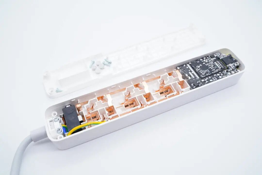 插线板设计上采用长条机身,十分节省桌面空间。充电头网拆解了解到,插线板机身壳采用防拆螺丝封装,内置一体成型铜带无断点,且固定牢固。充电器PCB板使用机身壳隔离板固定和进行初次级隔离。