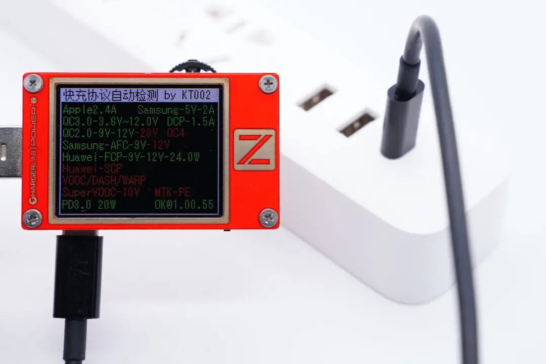 另外使用KT002测得USB-C口支持Apple 2.4A、Samsung 5V2A、DCP协议,以及QC2.0/3.0、AFC、FCP、PD3.0快充协议。