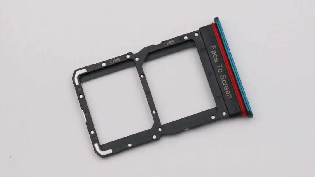 卡托特写,支持双卡双待,另外卡托上印有Face To Screen提示字样,避免装回去时搞反。
