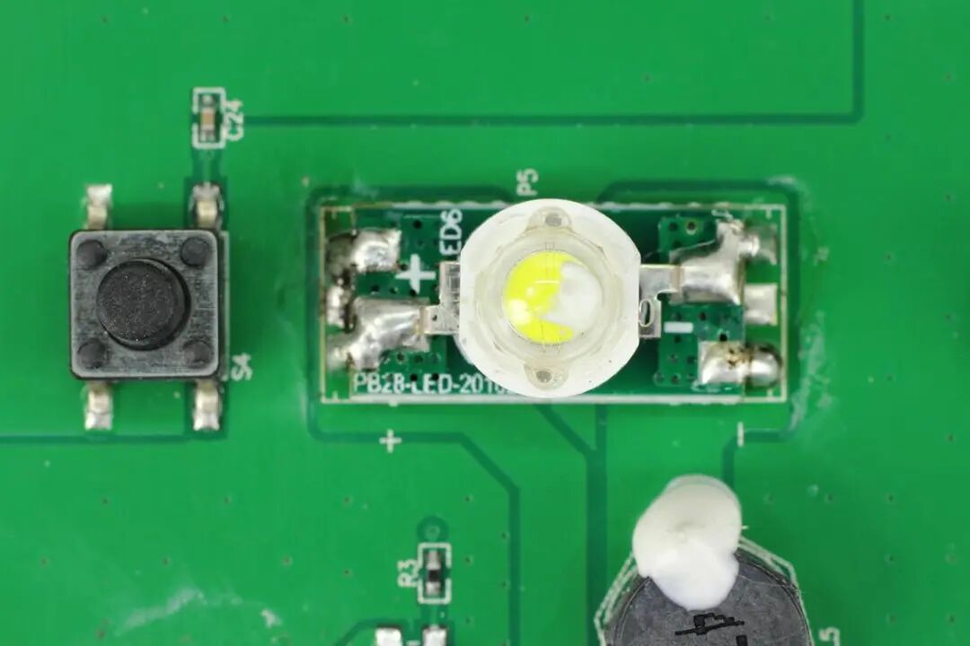 华润矽威 PT4115 高亮LED驱动芯片,最高输出电流1.2A,开关降压模式驱动。旁边的470降压电感打胶固定。