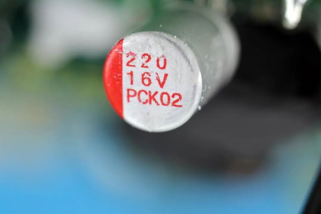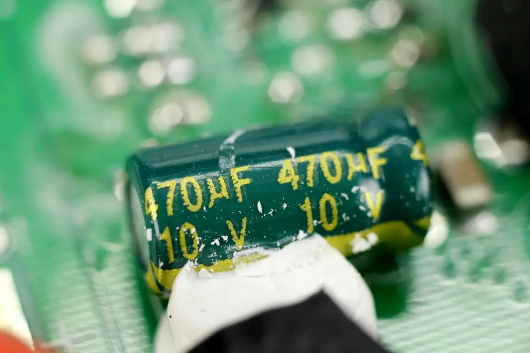 滤波电解电容特写,规格为25V 220μF,用于USB-C口输出滤波。