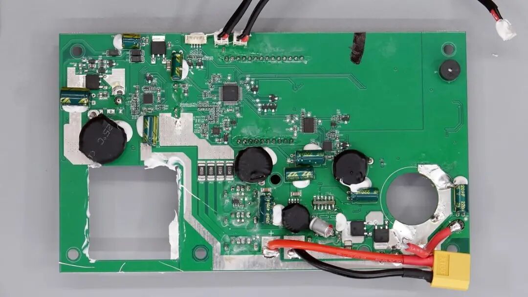 布局上,最上端是逆变升压模块,下方是电池组,前端固定有功能模块电路板,三者间通过导线插拔式连接。