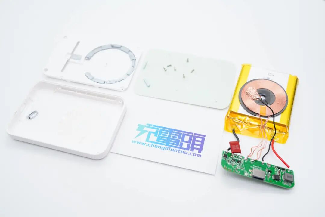打开外壳后的这款移动电源,内部模块看起来略显简陋,仅有一块电池、一块PCB板,以及一个线圈。