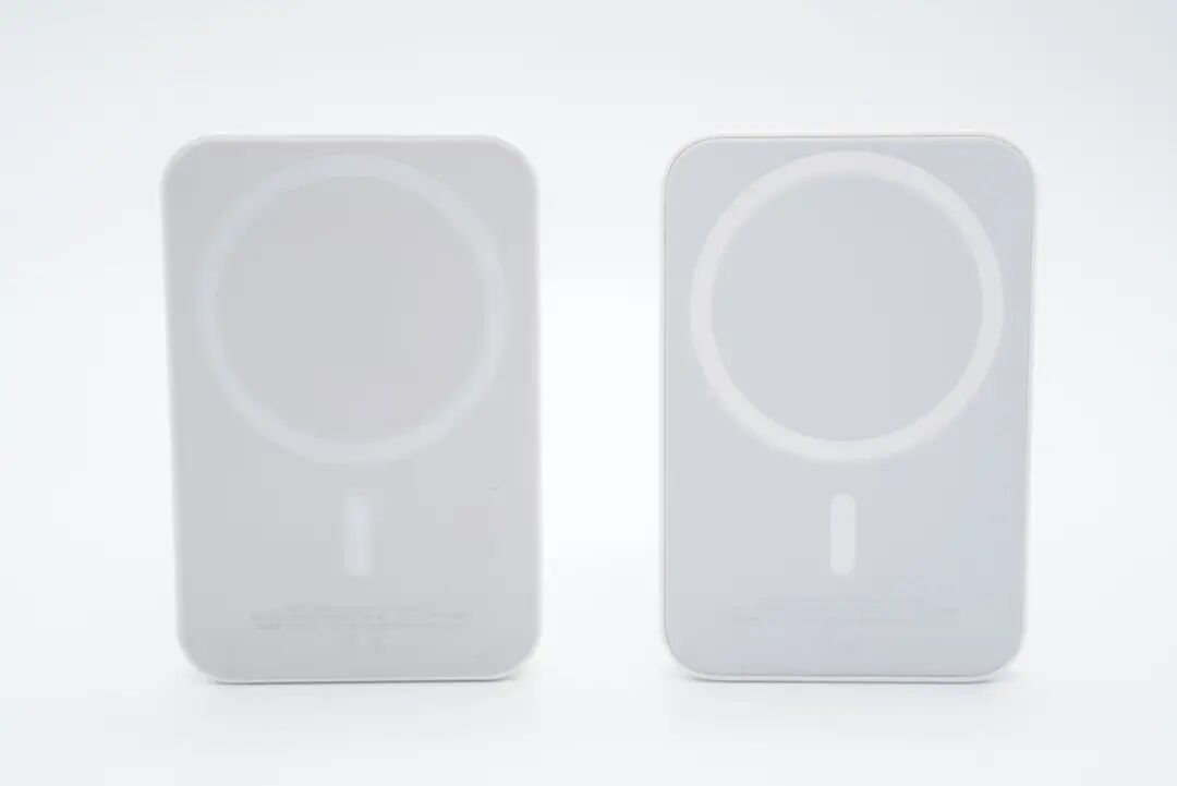 对比苹果原装MagSafe磁吸无充电宝(右侧),华强北这款颜色略暗。
