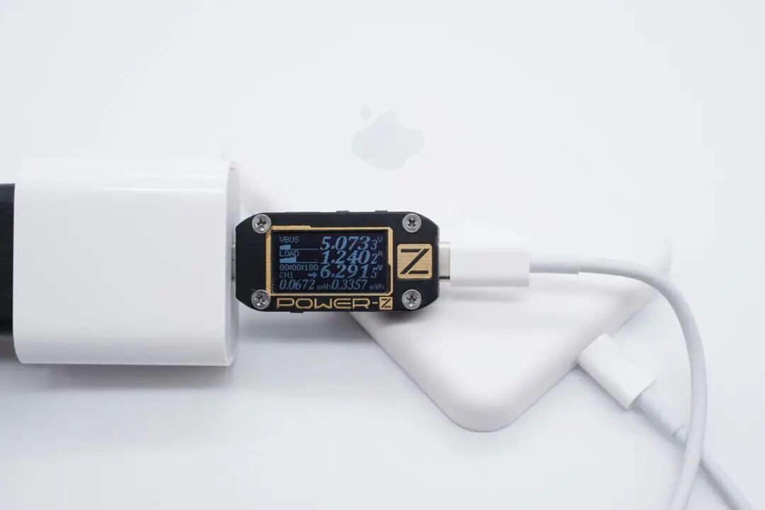 使用苹果20W PD快充充电实测,ChargerLAB POWER-Z KM001C测得这款产品的输入功率约为6.3W,并没有进入9V快充模式。