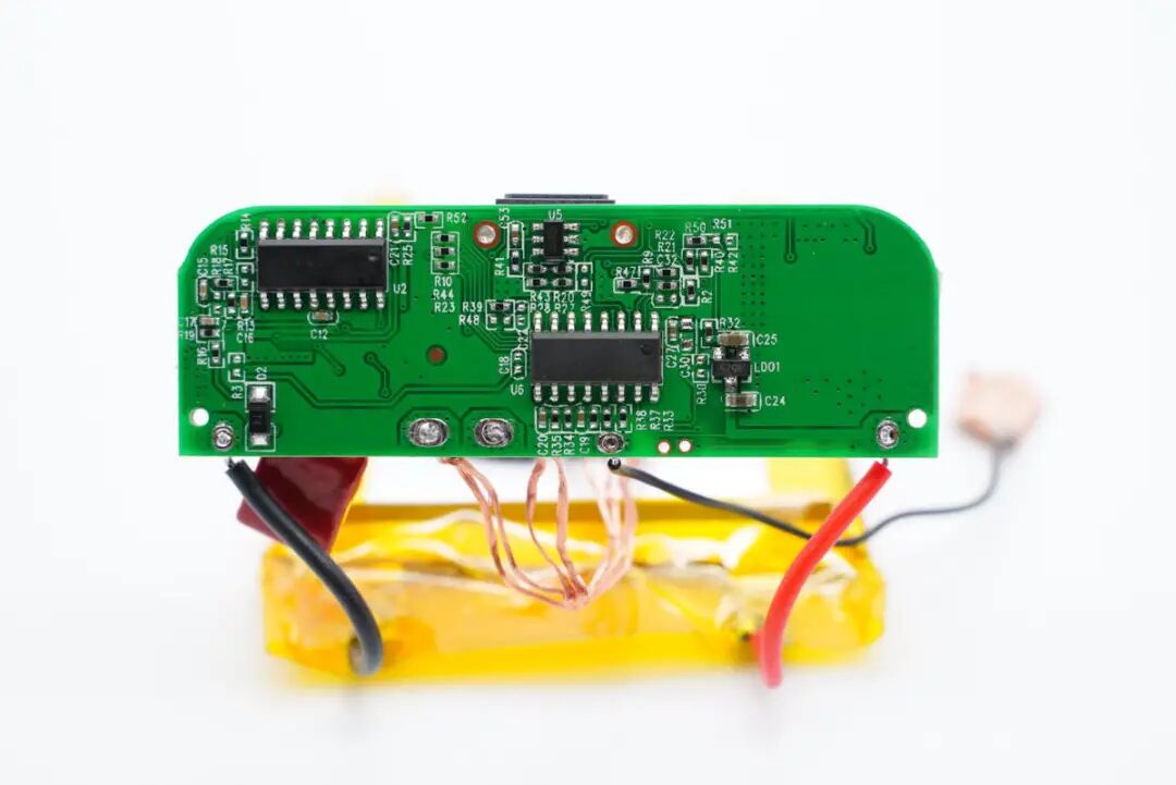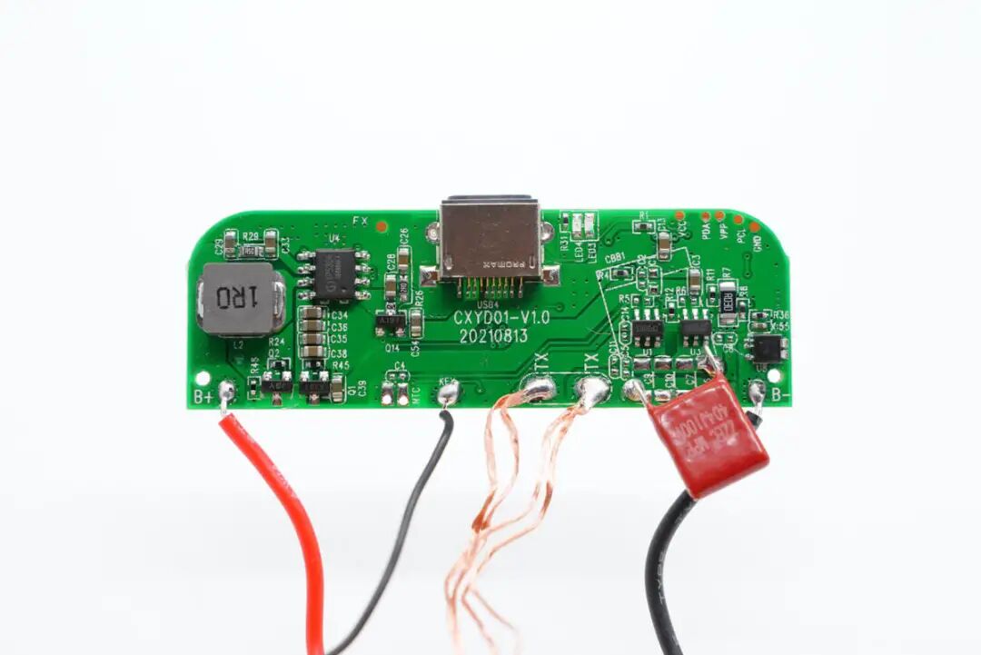PCB板上除了线圈之外,还多了一根线,末端连接铜箔并贴在外壳上,用作电容感应开关。当手机与外壳贴合时,用于激活移动电源无线充电输出。