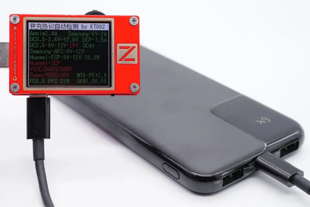 使用ChargerLAB POWER-Z KT002检测USB-C口输出协议,显示支持Apple 2.4A、Samsung 5V2A、DCP协议,以及QC2.0/3.0、AFC、FCP、PE2.0、PD3.0、PPS快充协议。