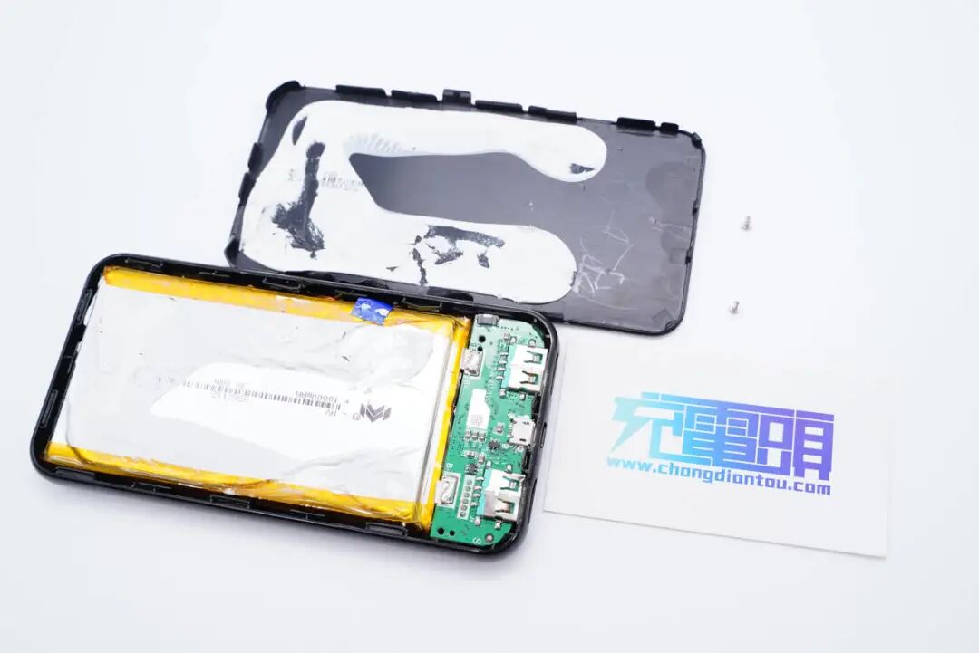 将移动电源机身拆开,边缘采用卡扣封装,机身壳打胶帮助电芯固定和导热。