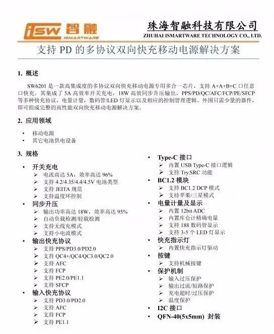 移动电源主控芯片采用智融SW6201。这是一款高集成度的多协议双向快充移动电源专用多合一芯片,支持 A+A+B+C 口任意口快充。其集成了5A高效率开关充电,18W高效同步升压输出,PPS、PD、QC、AFC、FCP、PE、SFCP等多种快充协议,电量计量,数码管/LED灯显示以及相应的控制管理逻辑。外围只需少量的器件,即可组成完整的高性能双向快充移动电源解决方案。