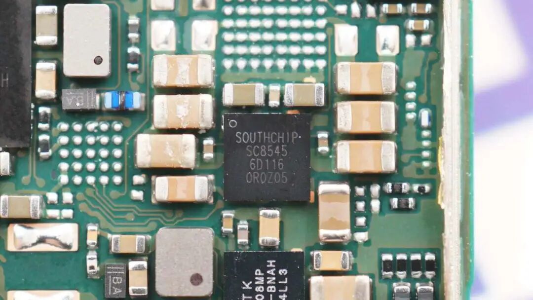 HONOR荣耀X20 SE手机中使用的南芯电荷泵SC8545芯片,可以看到电荷泵芯片外围是多颗电容。电荷泵无需电感,降低了传统开关降压电路的损耗。相比传统降压电路90%左右的效率,电荷泵的效率可达98%左右,大大减小了充电时的发热,让快充体验更好,能在手机上大面积普及。