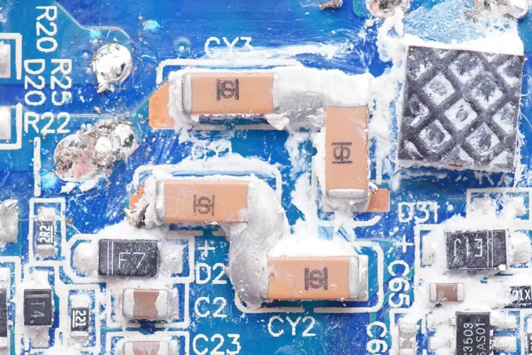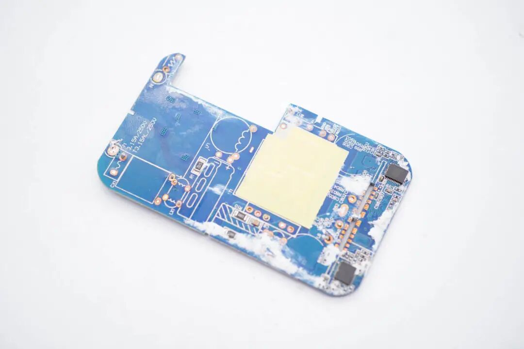 氮化镓功率开关管所在区域设有导热垫和散热片,导热垫镂空处可以看到开关电源主控芯片和光耦。