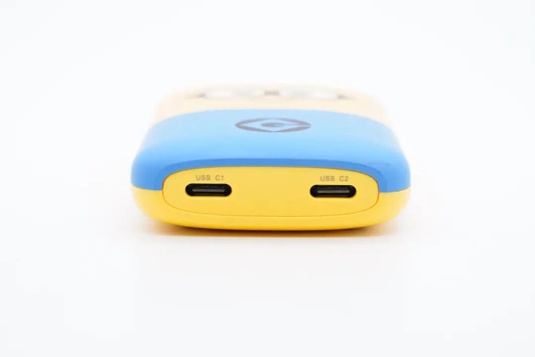 外观是基于小黄人形象设计,黄蓝经典配色,机身正面印有戴着眼镜的两只大大的眼睛,蓝色区域设计有大写的G字logo,整体非常的生动可爱,给用户带来不一样的充电体验。