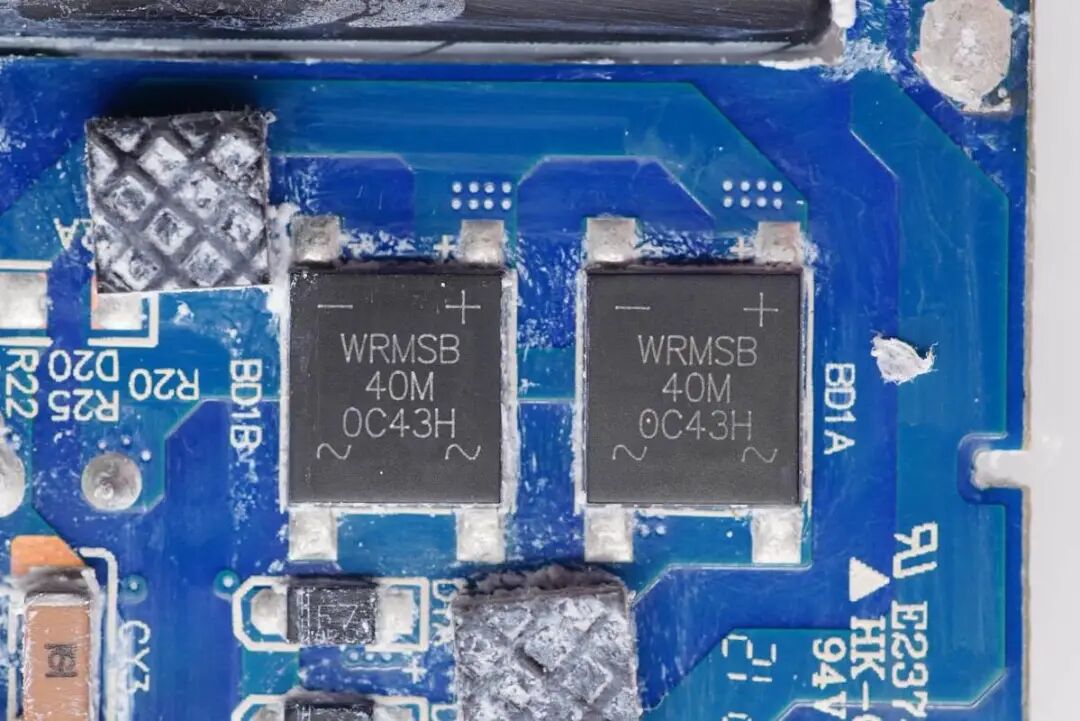 WRMSB40M整流桥来自沃尔德,两颗均摊发热。充电头网拆解了解到,采用沃尔德整流桥的产品还有羽博65W 1A1C氮化镓充电器、努比亚红魔120W氮化镓充电器、OPPO 50W饼干氮化镓快充、鸿达顺65W 氮化镓充电器、飞频65W USB PD氮化镓充电器、ROCK 65W氮化镓充电器、麦多多65W氮化镓充电器、麦多多30W 1A1C快充充电器等多款产品采用,性能获得客户的一致认可。