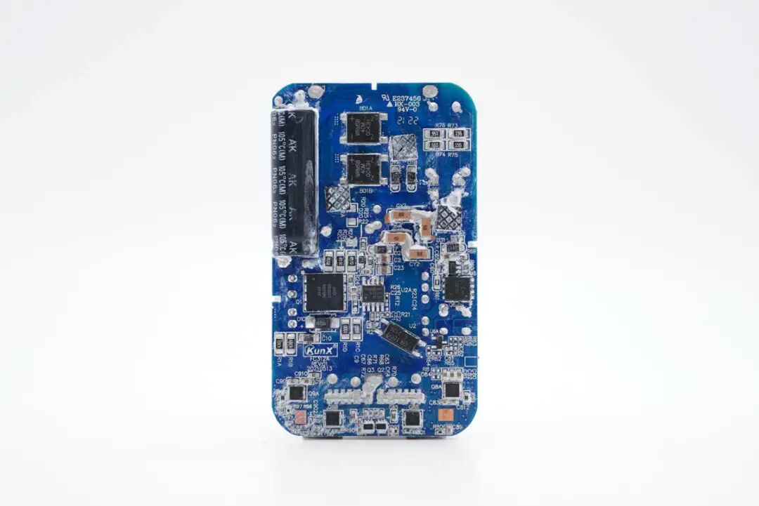 充电头网拆解了解到,充电器内部安规X电容、高压滤波电容横置,采用十分扁平小巧的变压器,这也是这款充电器能够做得如此薄的原因。散热方面,大量填充导热胶以及配有散热片、导热垫帮助散热。
