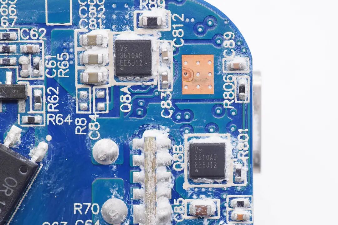 两颗输出VBUS开关管也是采用的威兆VS3610AE,对应有5毫欧采样电阻。