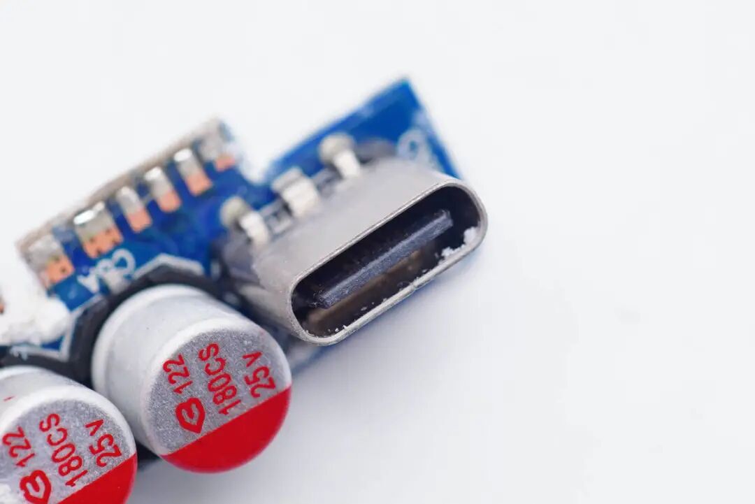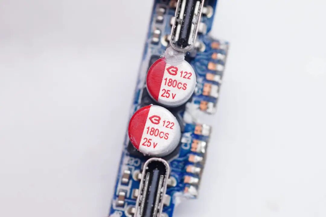 输出端小板正面设有两颗二次滤波固态电容以及两个USB-C母座。