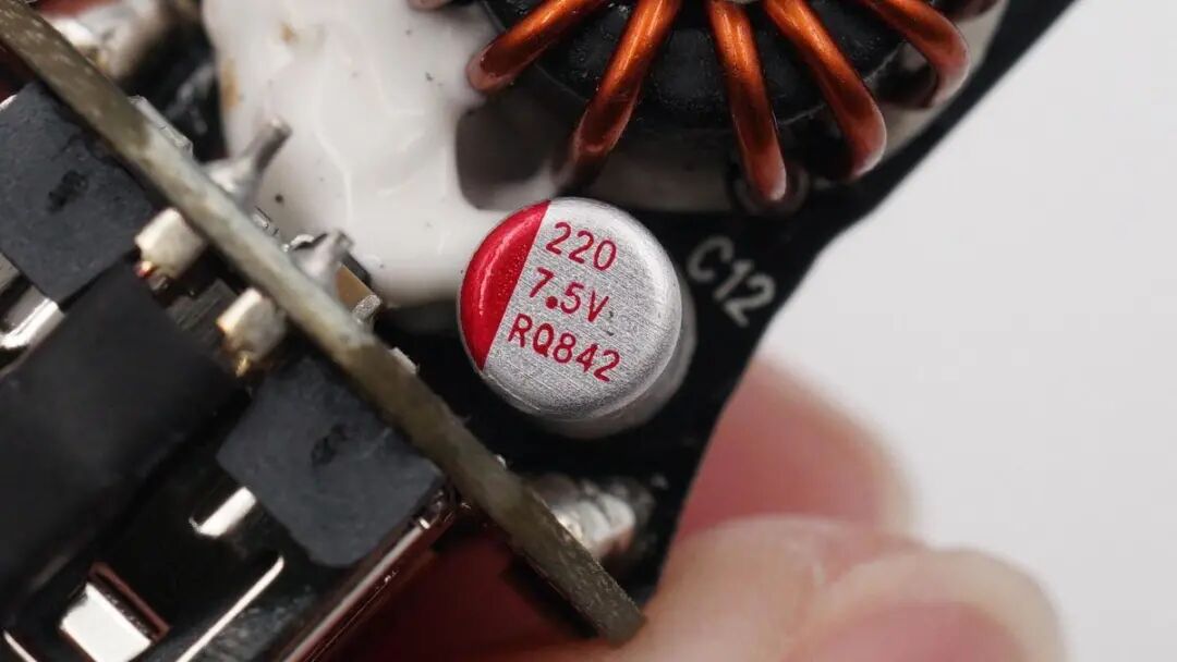 设有两颗用于滤波的固态电容和磁环降压电感,电感周围使用打胶固定。