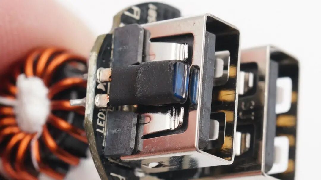 亚马逊这款双口车载充电器内部采用的是全套硅动力电源方案,由一颗降压芯片控制两颗MOS管组成降压电路,降压电感通过硅胶加固,分立器件的设计,支持最大5V4.8A功率,并可以避免发热集中。两个接口共用一颗赛芯微的协议芯片,无论单口还是双口输出,均支持Apple 2.4A协议,可以为手机提供最大12W的充电功率。