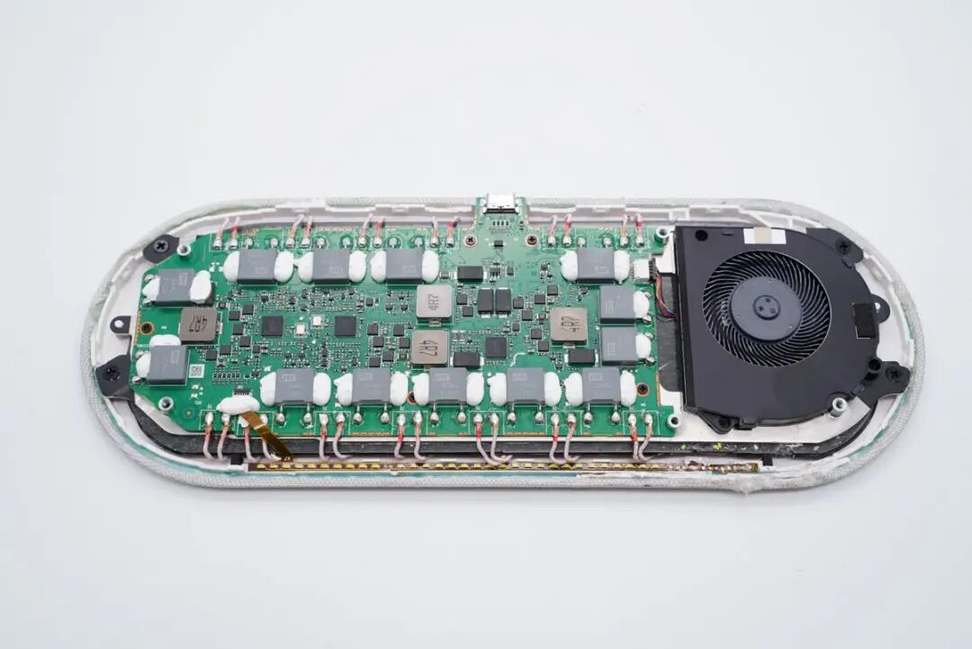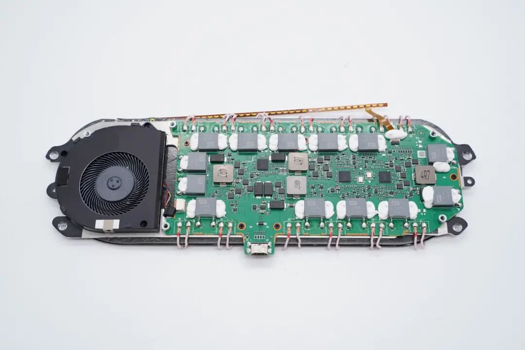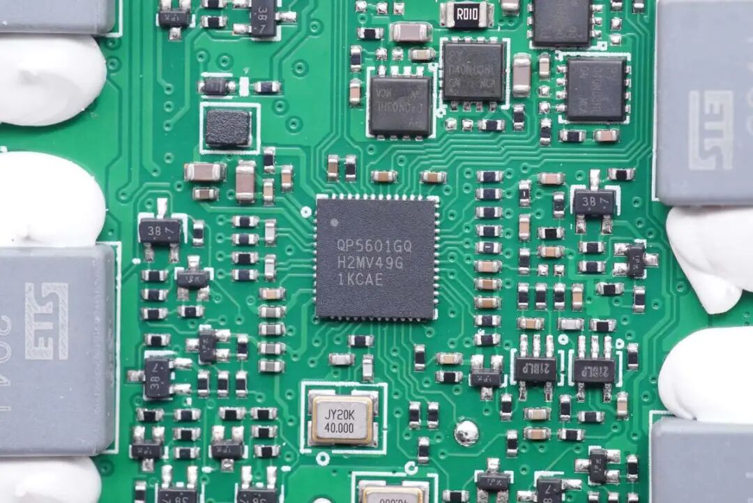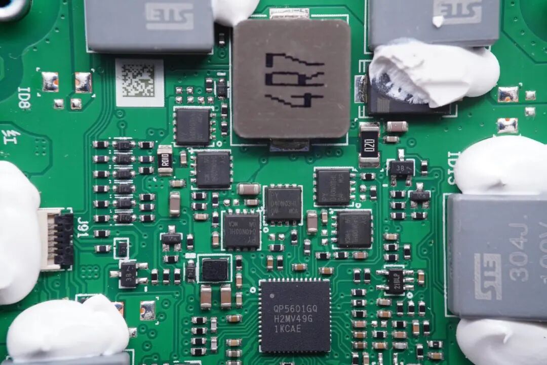 充电头网通过拆解了解到,充电板内置13个无线充电线圈,3层立体排布实现无死角输出,让设备怎么摆放都能进行无线充电。内置四路无线充电路,每路都配有降压供电电路。无线充电主控方案采用QP5601GQ,集成度非常高,另外采用多颗PY以及另一品牌的MOS管进行降压、线圈驱动和切换,采用国光聚合物叠层电容进行滤波,整体用料扎实。