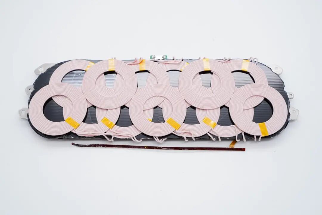 最顶面采用3层立体大线圈排布,一共13个,平板、手机、耳机、手表等设备都能随放随充,十分省心,此外隔磁片贴有绝缘纸。
